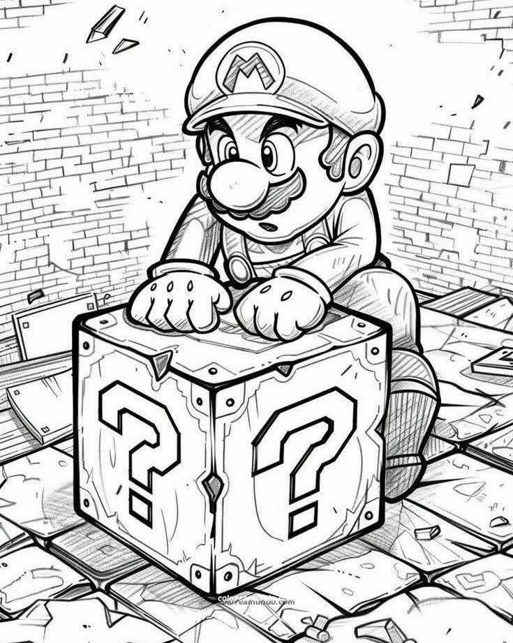mario bros tratando de abrir una caja misteriosa dibujo para colorear