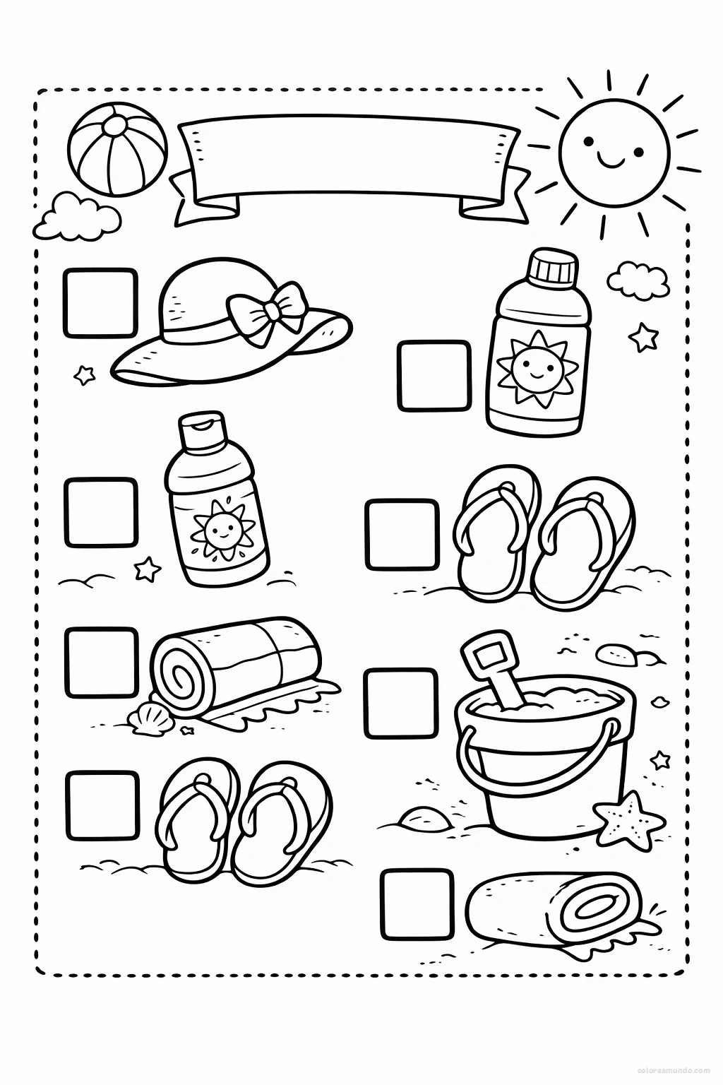 Plantilla simple para preescolar con iconos grandes para marcar y colorear: sombrero, bloqueador, agua, sandalias y juguete de playa. Ideal para practicar trazos y organización básica antes de salir.