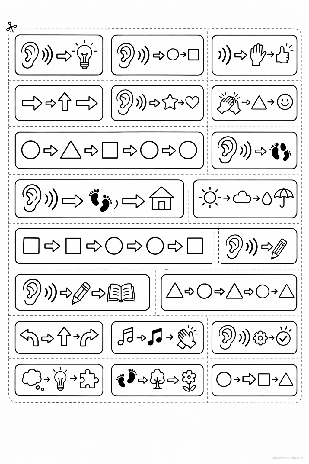 Conjunto de tarjetas con instrucciones orales progresivas para entrenar atención auditiva, memoria secuencial y comprensión en casa o aula.