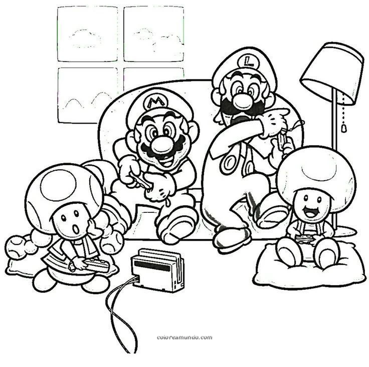 mario bros y luigi junto con toad jugando videojuegos en un sofa