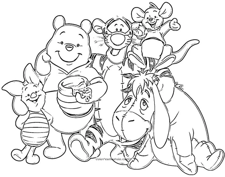 todos los amigos de winne the pooh abrazados y sonriendo tomandose una foto