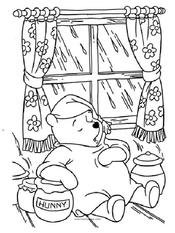 winnie the pooh durmiendo con su tarro de miel mientras llueve
